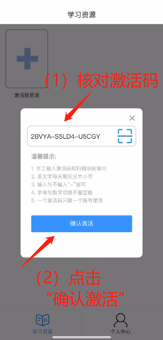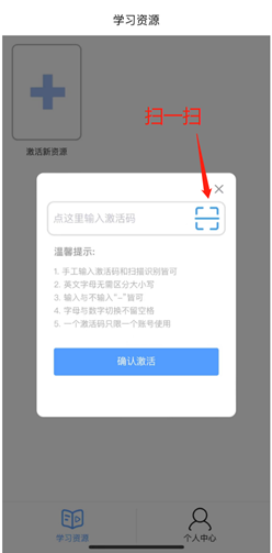 1. 在“学习资源”界面点击“激活新资源”进入资源激活引导;这里提供了两种方式进行资源激活,任选一种即可。