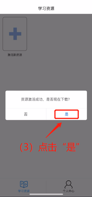 2.核对激活码并点击“确认激活”,系统会提示“资源激活成功,是否现在下载?”,点击“是”即可对已激活资源进行下载。